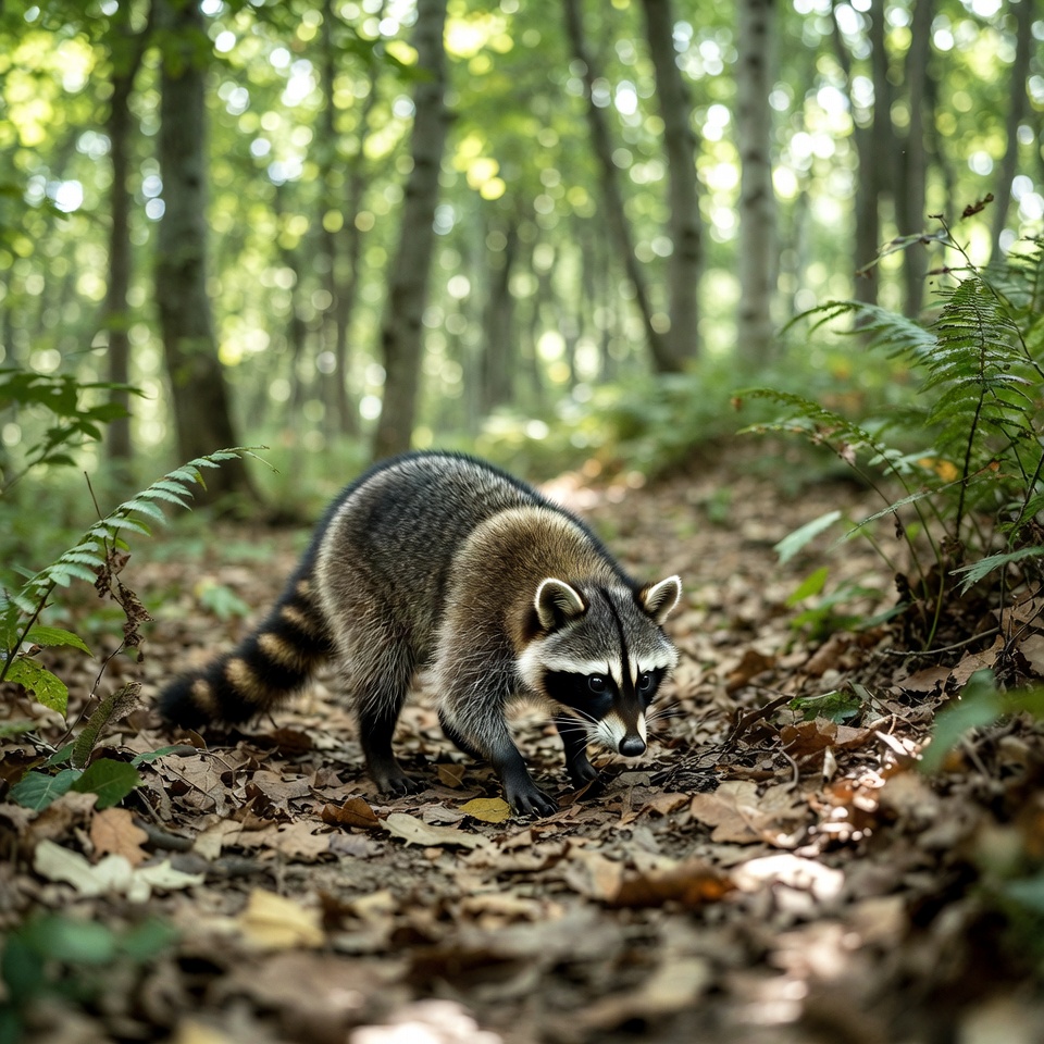 animal, dappled light, ferns, foliage, forest, forest path, green forest, leaves, masked face, nature, paws, raccoon walking, ringed tail, sunlight, trail, trees, wild raccoon, wildlife, woodland, raccoon
