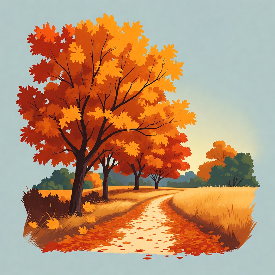 A vibrant illustration features tall trees with orange and red autumn leaves lining a winding path through a golden field. Fallen leaves scatter along the path, with additional trees visible in the background against a light blue sky. The scene captures a serene fall landscape in a stylized digital art style.