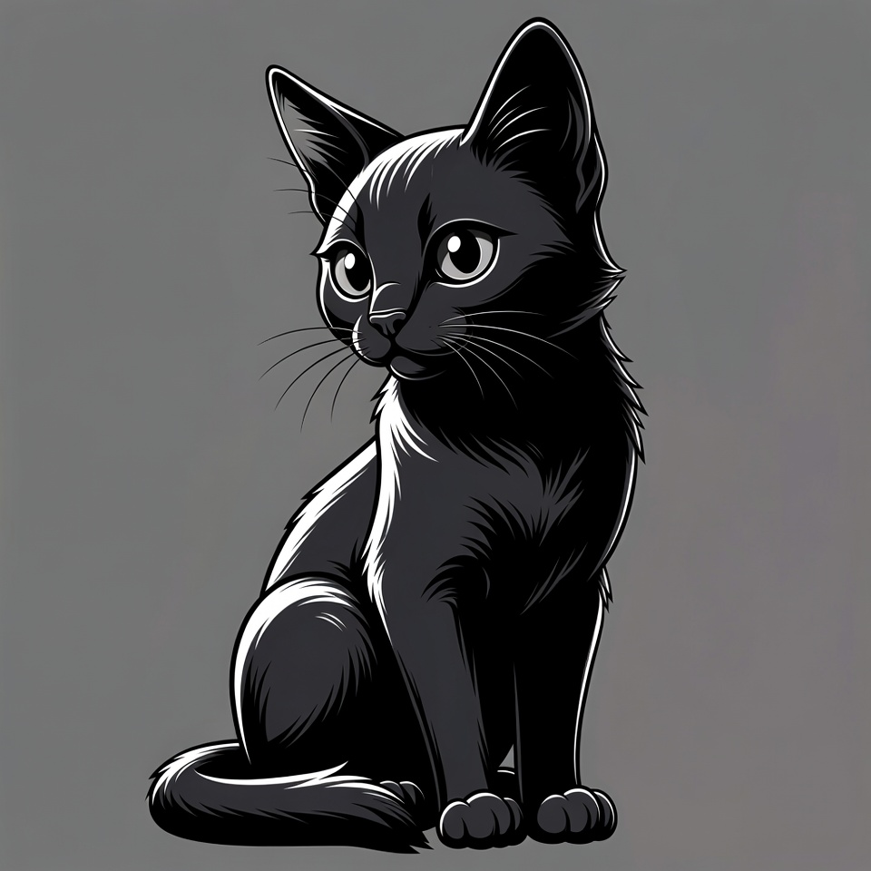 adorable cat, animal, big eyes, black cat, cat, clipart, cute kitten, furry kitten, gray background, illustration, isolated background, kitten, line art, pet, sitting cat, vector art, whiskers, black kitten