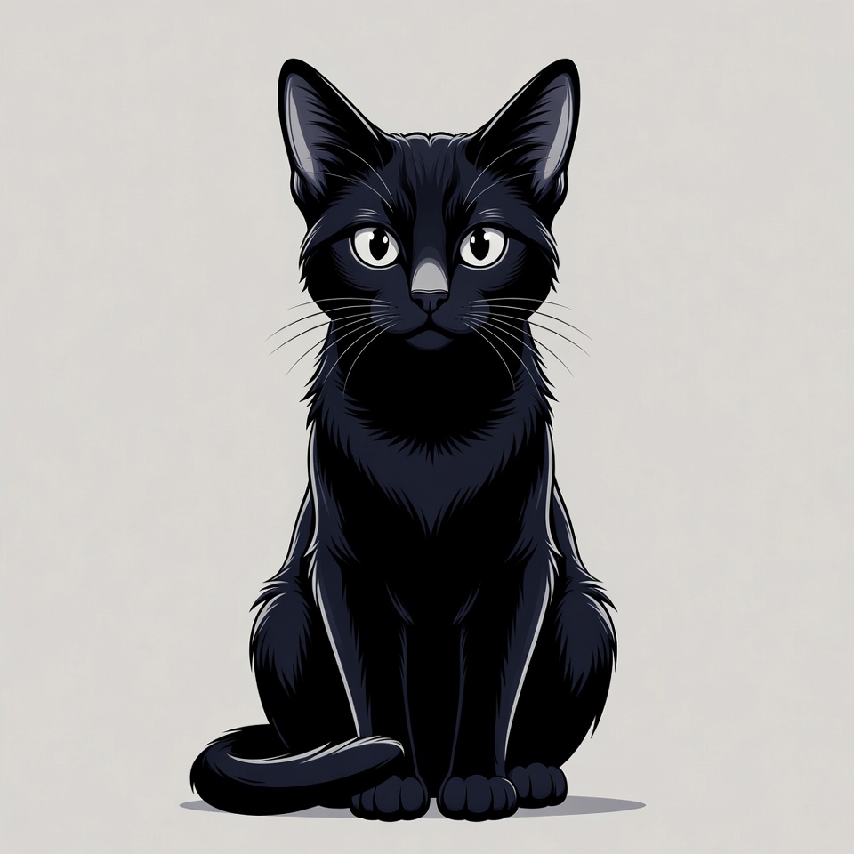 animal, cat, clipart, cute cat, digital art, feline, fluffy fur, illustration, isolated background, kitty, pet, pointed ears, sitting cat, vector art, whiskers, yellow eyes, black cat