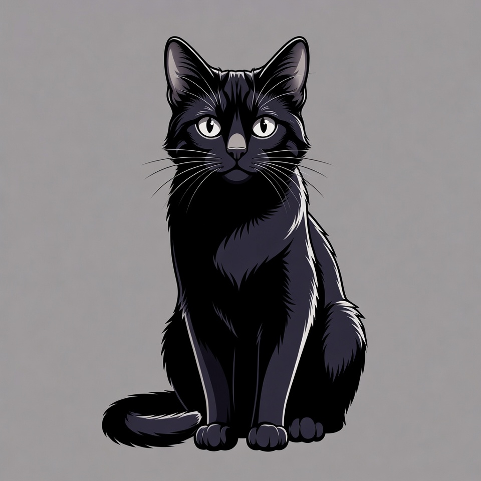 animal, cat, cute cat, digital illustration, feline, fluffy fur, gray background, green eyes, illustration, isolated background, pointed ears, sitting cat, vector art, whiskers, black cat