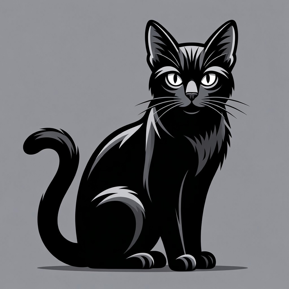 A stylized black cat sits with its tail curled around, featuring sharp green eyes and glossy fur. The illustration uses bold black outlines and shading on a gray background. It has a sleek, vector art design with detailed whiskers and paws.