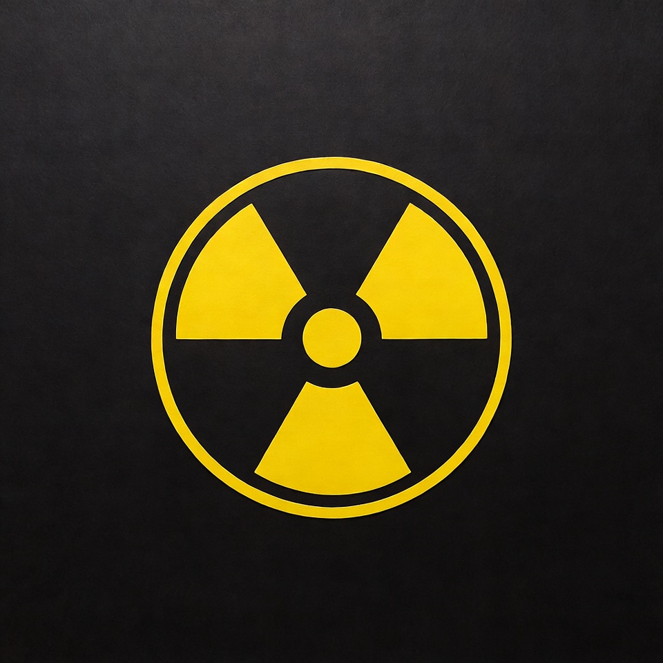 A bright yellow radiation trefoil symbol with three blades and a central circle sits prominently on a solid black background. The symbol is outlined in yellow and appears bold and isolated. It is a standard hazard warning icon.