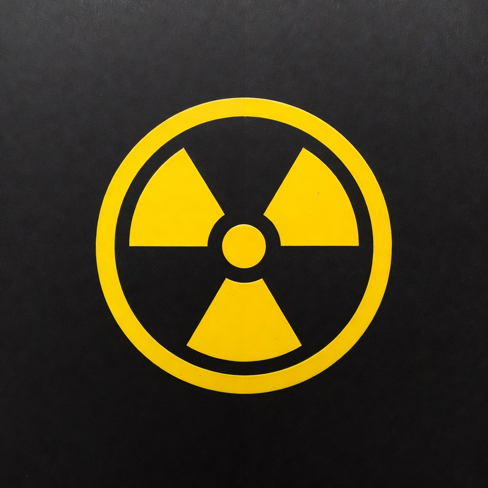 A bright yellow radiation trefoil symbol with three blades is centered in a black circle on a solid black background. The iconic hazard sign features a small black circle at its core. It stands out sharply against the dark backdrop.