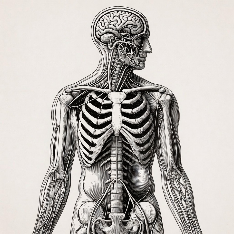 White, anatomical illustration, arms, biology, body systems, brain, engraving, human anatomy, illustration, isolated background, male, medical illustration, muscles, nerves, nervous system, pelvis, physiology, profile, ribcage, scientific drawing, side view, skeleton, skull, spine, vintage anatomy, anatomy