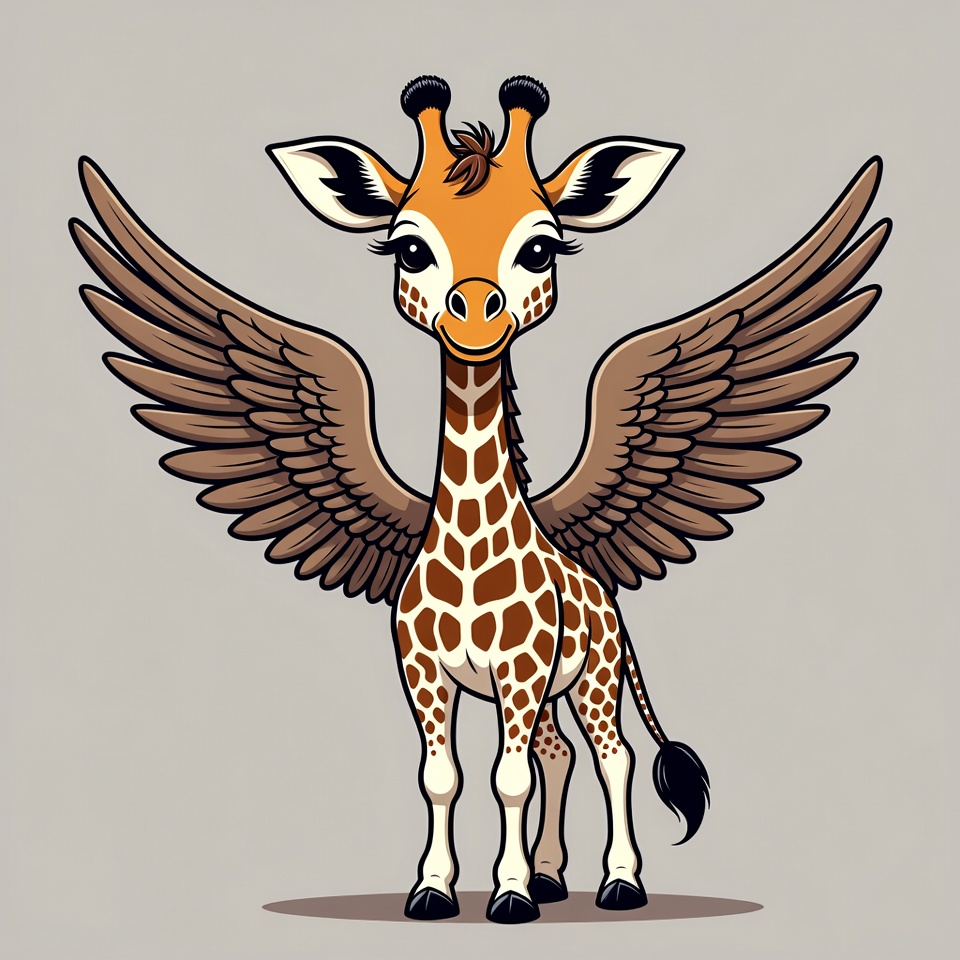 A cartoon giraffe with large brown wings stands on a light gray background. It has a baby-like face with big eyes, orange-brown spots, and short horns. The illustration features vibrant colors and a whimsical style.