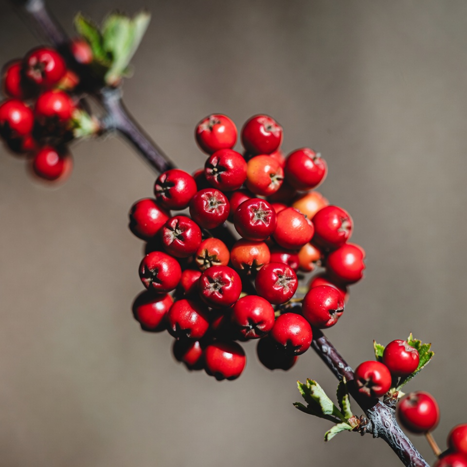autumn berries, berries, berry cluster, botany, branch, closeup, cluster, foliage, fruit branch, glossy berries, green leaves, macro photography, natural background, nature, plant, ripe fruit, thin branches, vibrant red, wild berries, red berries