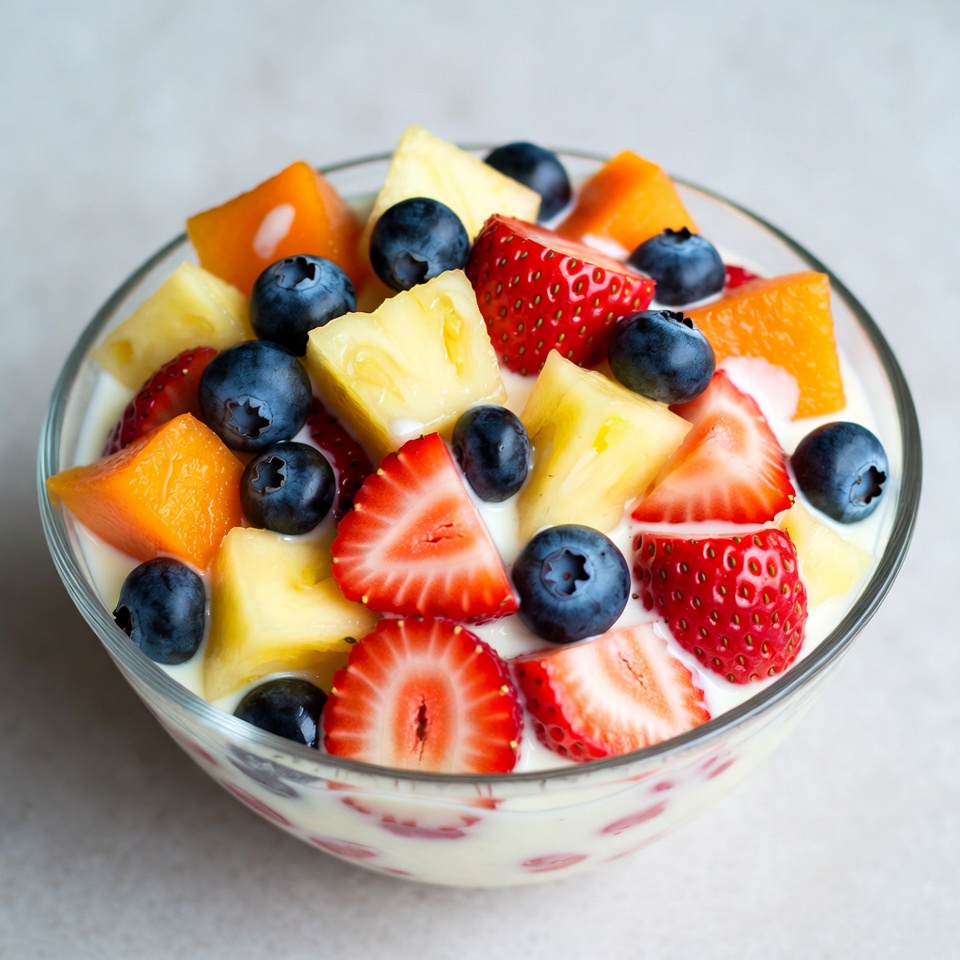 A clear glass bowl filled with creamy white yogurt topped with a colorful mix of fresh fruits. Sliced strawberries, blueberries, pineapple chunks, and cantaloupe pieces are arranged vibrantly on top. The bowl sits on a plain white surface with a subtle colorful pattern visible through the glass.