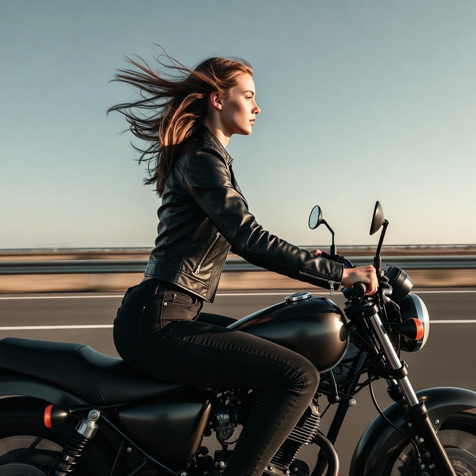 A young woman with long flowing red hair rides a black motorcycle on a highway at sunset. She wears a black leather jacket and tight black jeans, leaning forward with wind blowing her hair. The background features a clear blue sky and open road.
