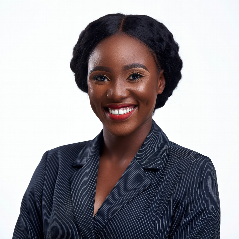 Black woman, black hair, blazer, braided hair, eyes, female, headshot, lips, makeup, pinstripe, portrait, professional, smiling, suit, white background, woman, young woman, African-American woman