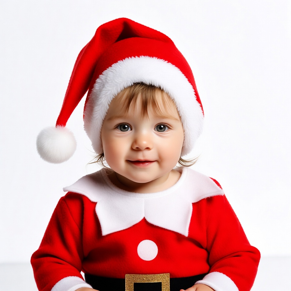 Christmas costume, Santa Claus, White, black belt, blonde hair, blue eyes, boy, cute child, festive baby, gold buckle, holiday outfit, infant, isolated background, pom-pom, red hat, smiling baby, white fur, baby boy
