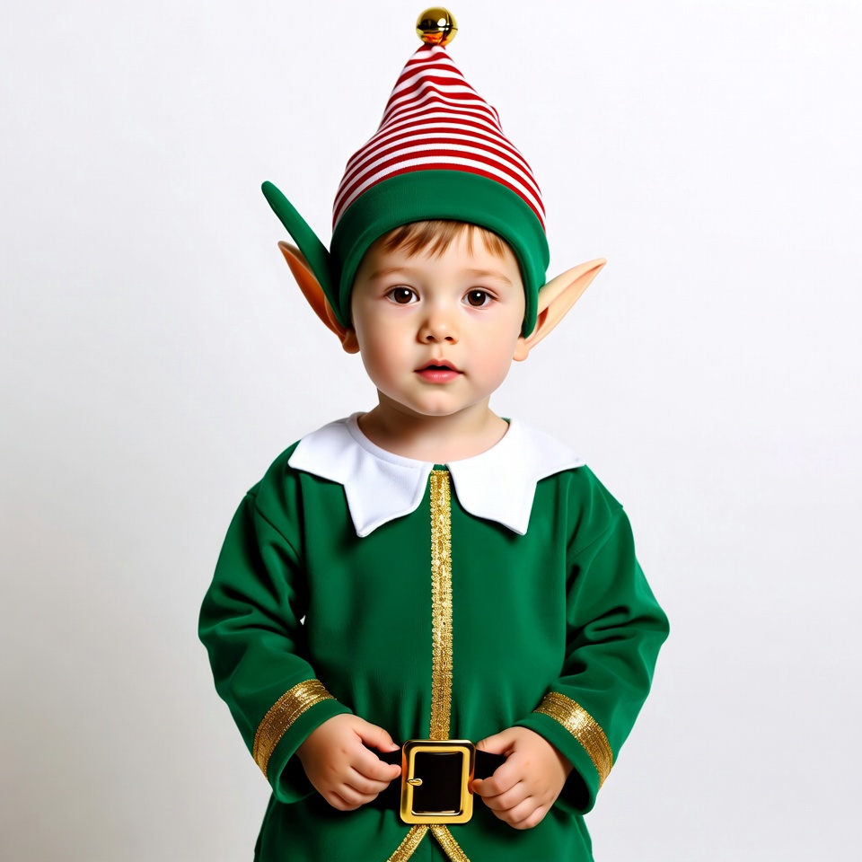 A young boy with light brown hair wears a green elf costume with red and white striped hat, pointy ears, and gold trim. He stands frontally with hands on a gold belt buckle against a white background. His expression is neutral with wide eyes looking at the camera.