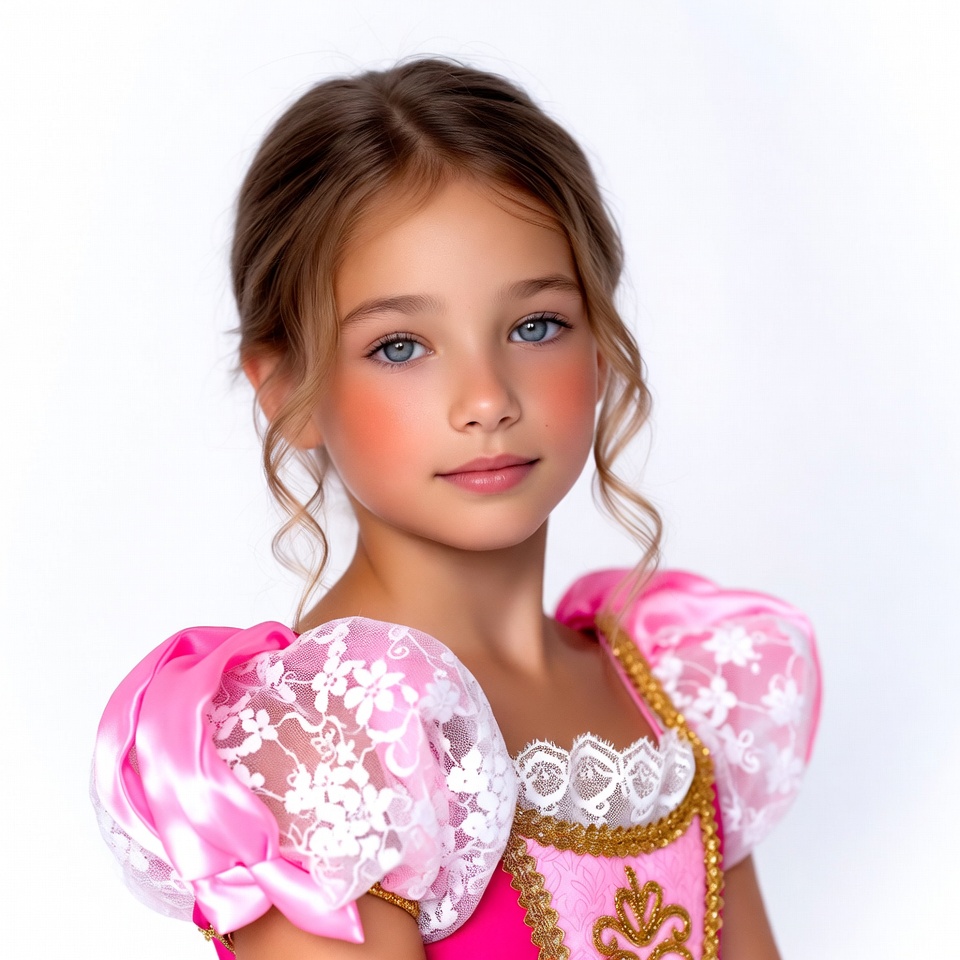 White, blue eyes, brown hair, child, costume, elegant dress, fashion, formal wear, gold embroidery, gown, isolated background, lace sleeves, pink dress, portrait, princess dress, puffed sleeves, wavy hair, young girl, girl