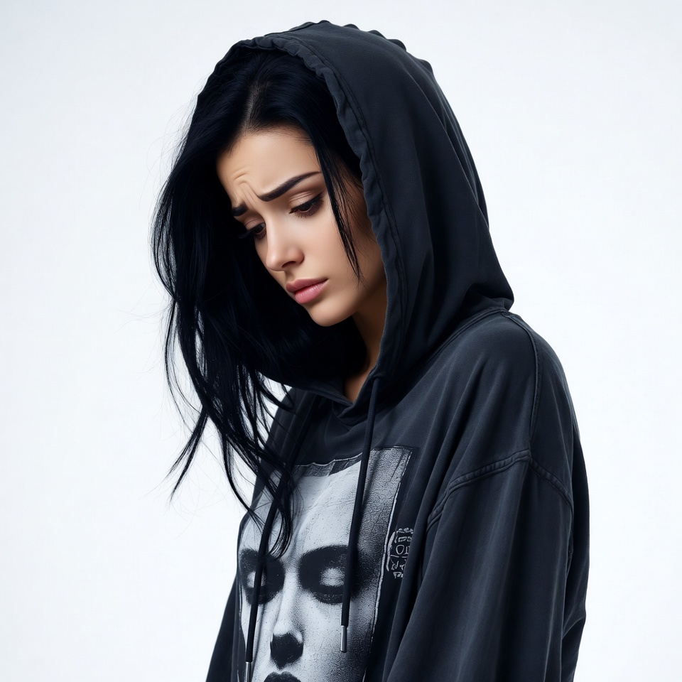 A young woman with long black hair wears an oversized black hoodie with a white female face print on the chest. She has her hood up, tilts her head down with a pensive frown, and gazes slightly to the side against a plain white background. Her dark eyes and full lips emphasize her melancholic look.