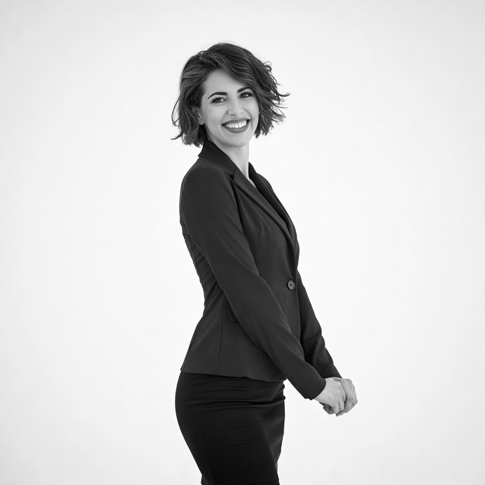 A woman with wavy shoulder-length hair stands smiling over her shoulder against a white background. She wears a fitted black blazer with a notched lapel and a matching knee-length pencil skirt. The image is in black and white.