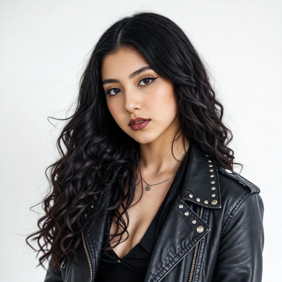 A young woman with long wavy black hair poses confidently against a white background. She wears a black studded leather jacket over a low-cut black top and a delicate necklace. Her makeup features dark eyeliner and maroon lips.
