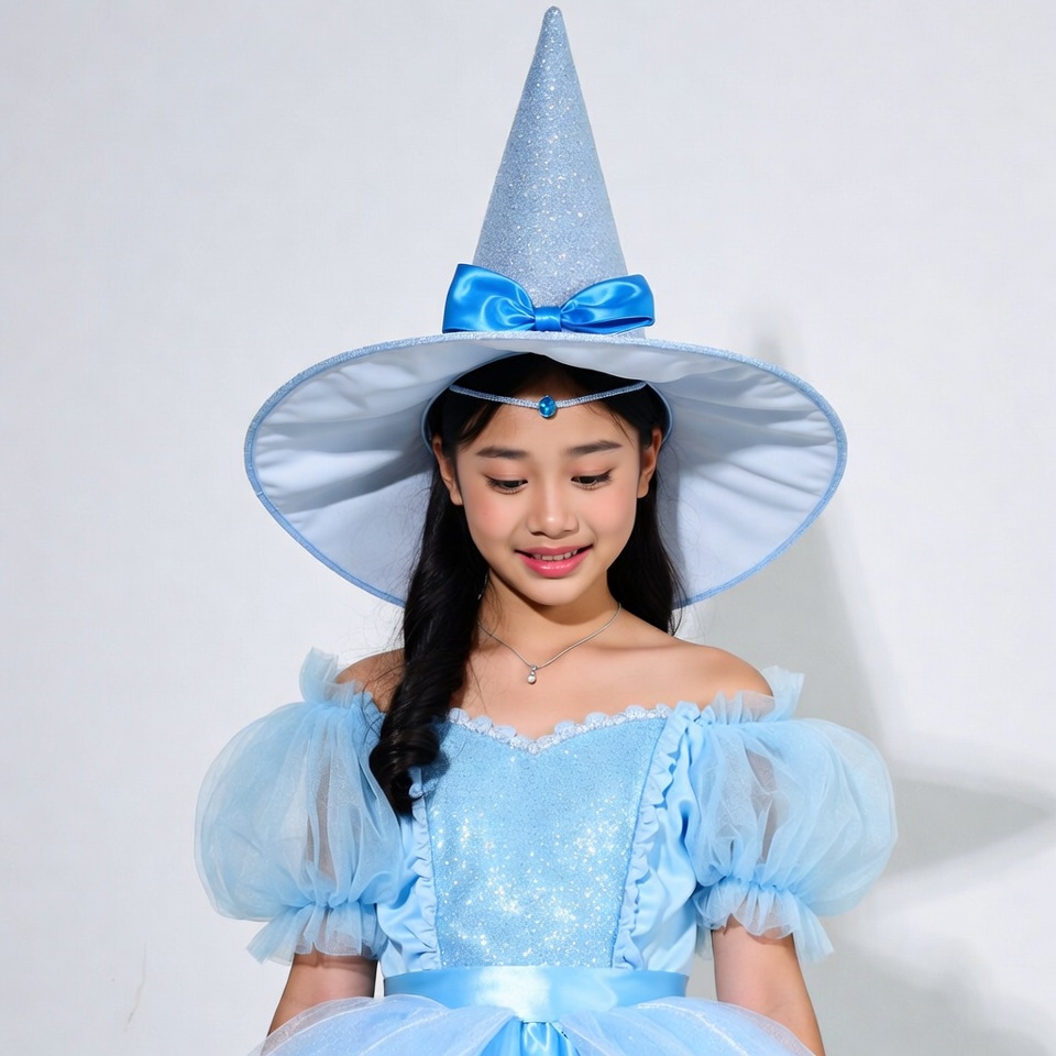 A young Asian girl with long black hair wears a sparkling blue witch costume with a large pointed hat adorned with a blue bow. The off-shoulder dress features sheer puffed sleeves, lace details, and a tulle skirt. She stands smiling against a white background.