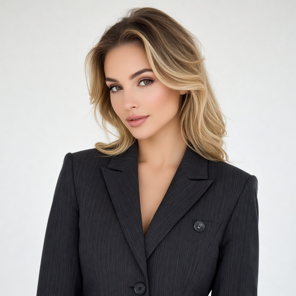 A young woman with long wavy blonde hair poses confidently against a white background. She wears a tailored black pinstripe blazer with a deep V-neckline and subtle buttons. Her makeup is elegant with pink lips and she gazes directly at the camera.