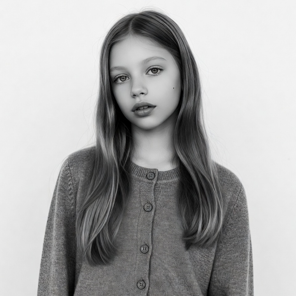 A young girl with long straight hair stands against a white background in a black and white portrait. She wears a buttoned sweater and gazes directly at the camera with a subtle expression. Her hair falls over her shoulders.