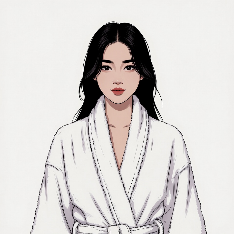 An illustration of a young Asian woman with long black hair wearing a white bathrobe. She faces forward with a gentle expression, her hair parted in the middle and falling over her shoulders. The bathrobe features a deep V-neck and is tied with a belt on a plain white background.