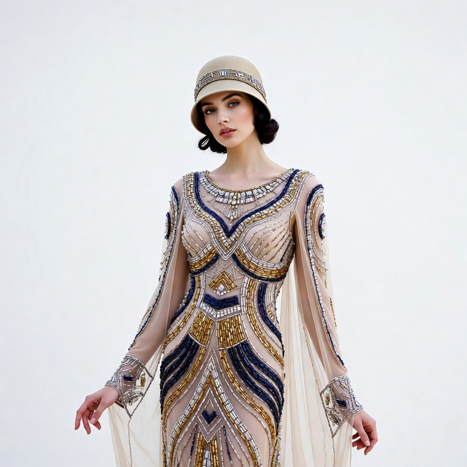 A young woman with pale skin and dark bobbed hair wears a beige cloche hat adorned with beads. She poses elegantly in a form-fitting, long-sleeved beaded gown featuring gold, navy, and crystal embellishments with flowing sheer sleeves. The image is set against a plain white background.