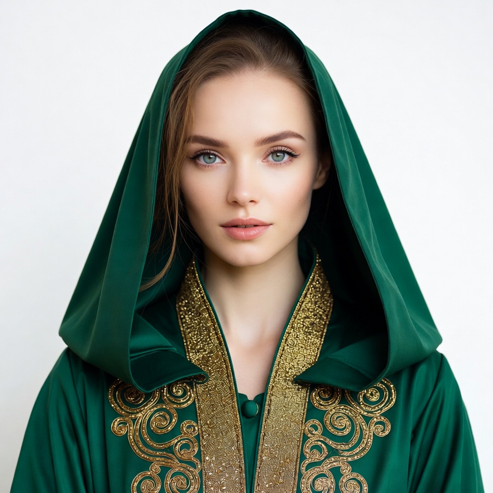 A young woman with long brown hair wears a vibrant green hooded robe with intricate gold embroidery along the edges and neckline. She gazes directly at the camera with light blue eyes and subtle makeup, standing against a plain white background. The hood frames her face softly.