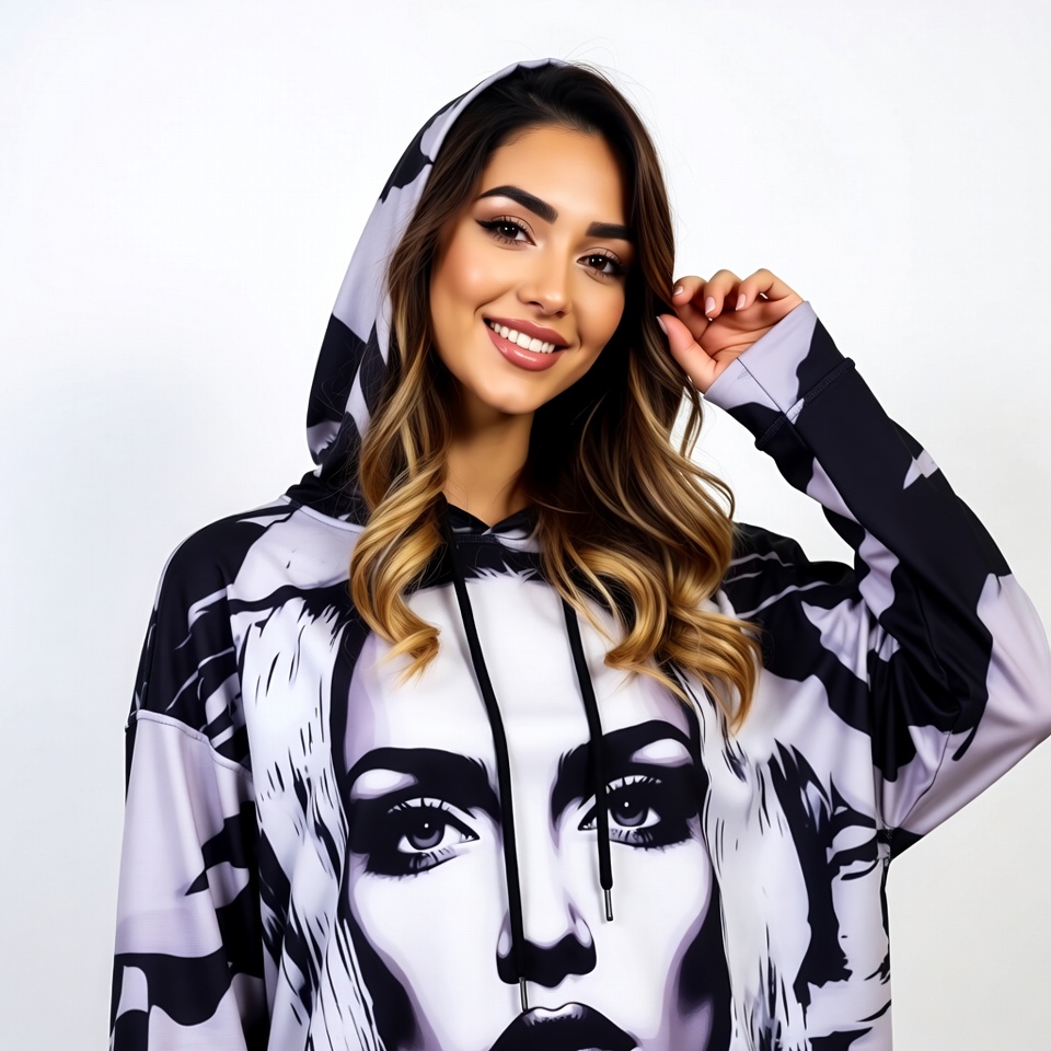 A young woman with long wavy blonde hair smiles confidently while wearing an oversized black and white hoodie featuring a large printed portrait of a woman's face. She has her hand raised to her face and poses against a plain white background. The hoodie has a hood and patterned design with bold facial features.