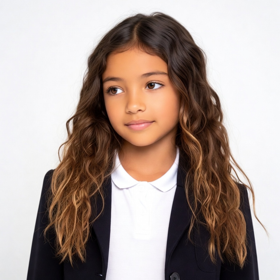 A young Asian girl with long wavy brown hair stands against a white background. She wears a navy blazer over a white collared shirt and looks slightly to the side with a subtle smile. Her expression is calm and her hair cascades over her shoulders.