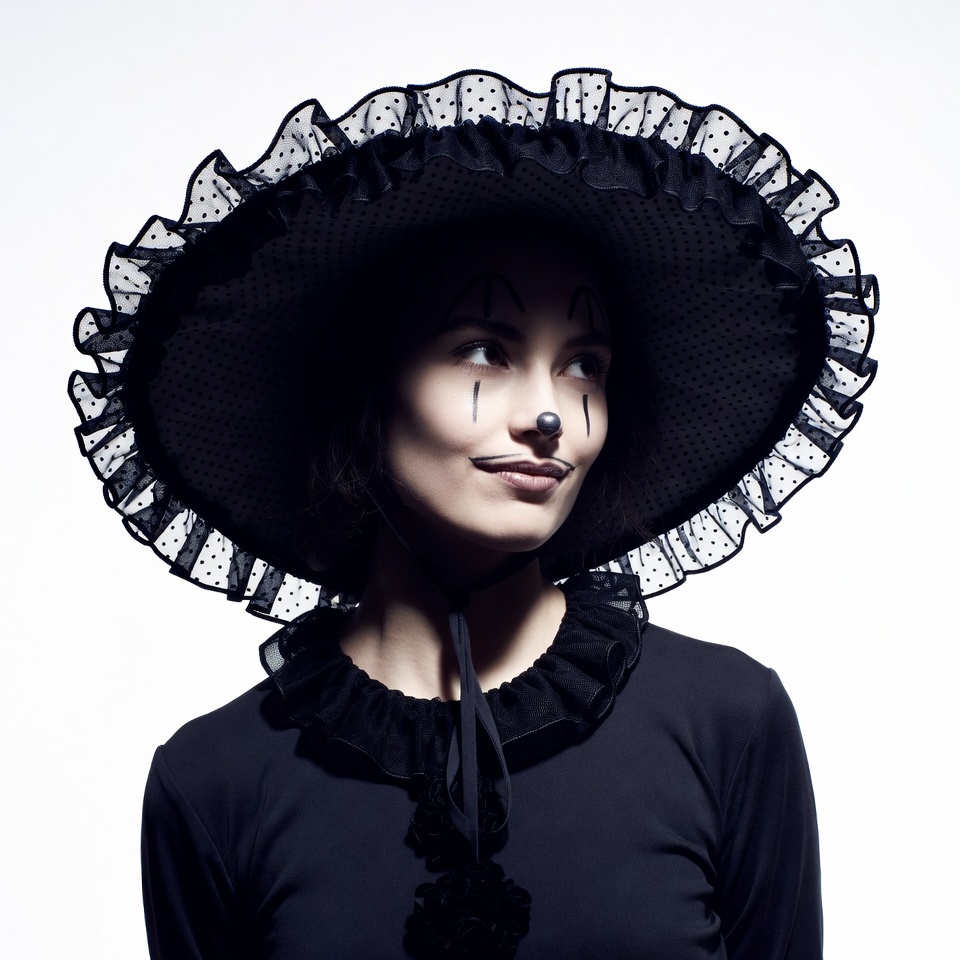 A woman with white clown face paint and black accents smiles while wearing a large black hat adorned with intricate white lace ruffles. She has dark shoulder-length hair and is dressed in a black outfit featuring a ruffled collar and neck bow. The image is set against a plain white background.