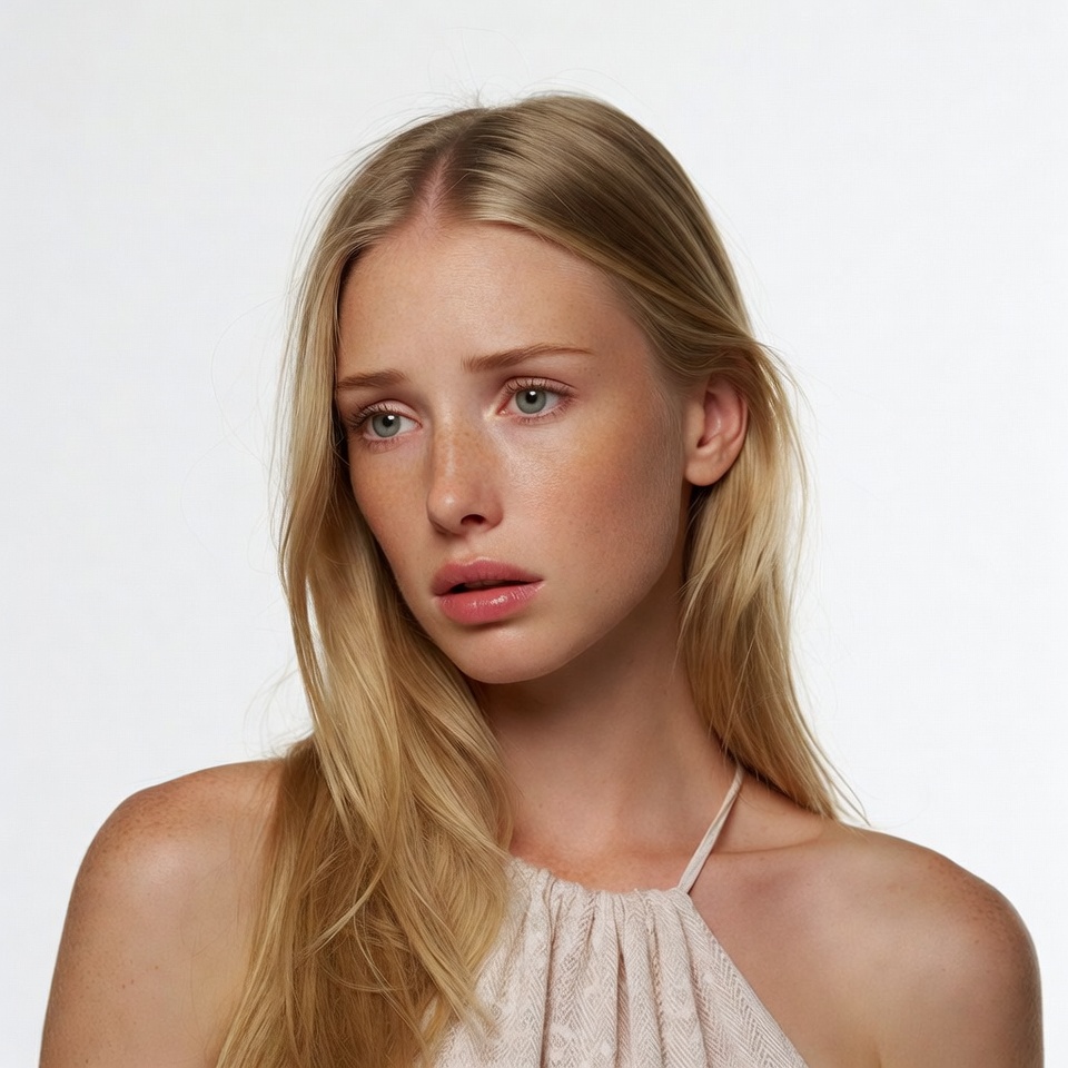 A young woman with long blonde hair gazes to the side with a thoughtful expression. She wears a white halter neck top with thin straps and has fair skin with freckles. The image is isolated on a plain white background.