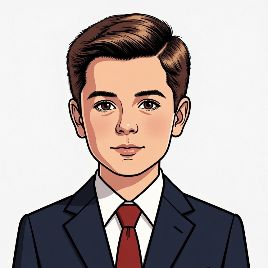 A cartoon boy with short brown hair and large eyes wears a navy blue suit, white shirt, and red tie. He faces forward with a neutral expression on a white background. The illustration features bold outlines and vibrant colors.