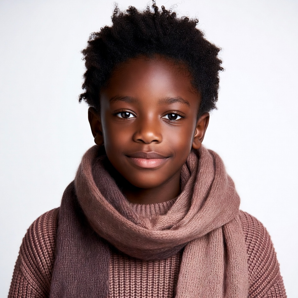 African, Black boy, big eyes, brown scarf, child, cozy scarf, curly hair, fashion boy, happy face, headshot, isolated background, knit scarf, knitwear, male, portrait, smiling boy, sweater, white background, young boy, boy