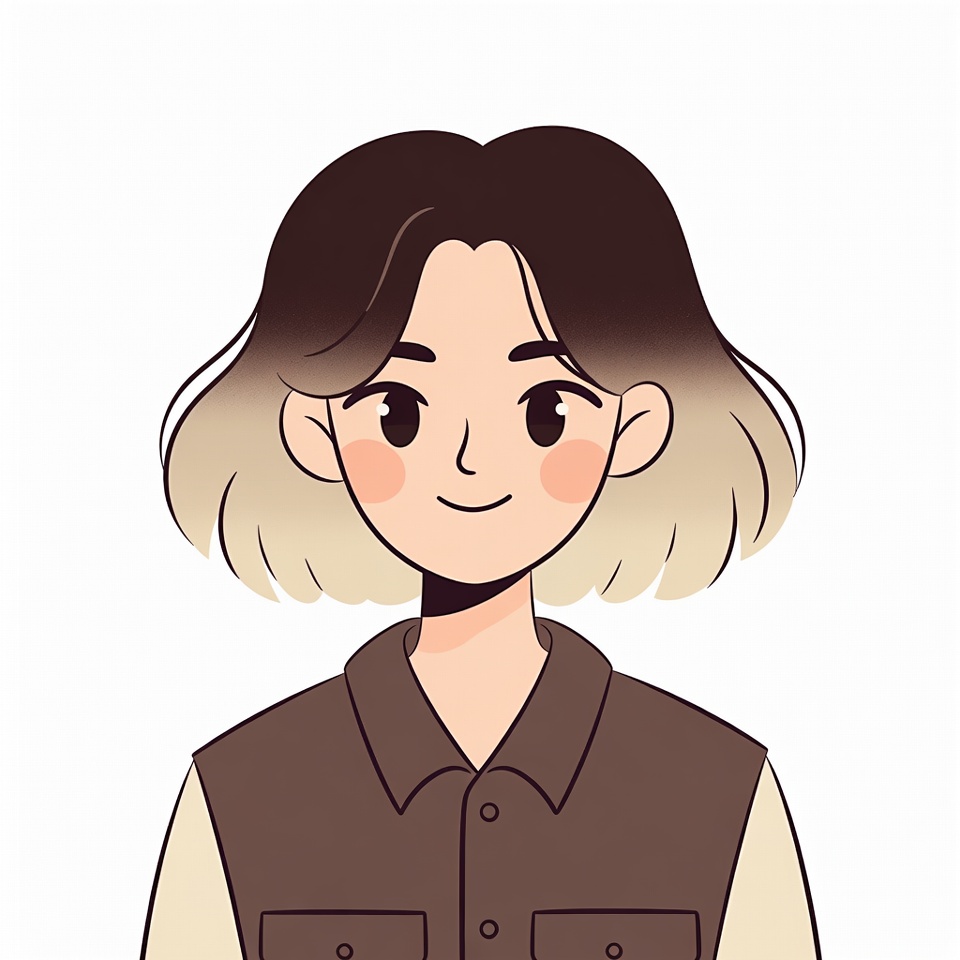 A cute anime-style illustration of a young boy with dark brown hair fading to blonde at the ends. He has large expressive eyes, rosy cheeks, and a gentle smile. He wears a brown varsity jacket with cream sleeves over a plain background.
