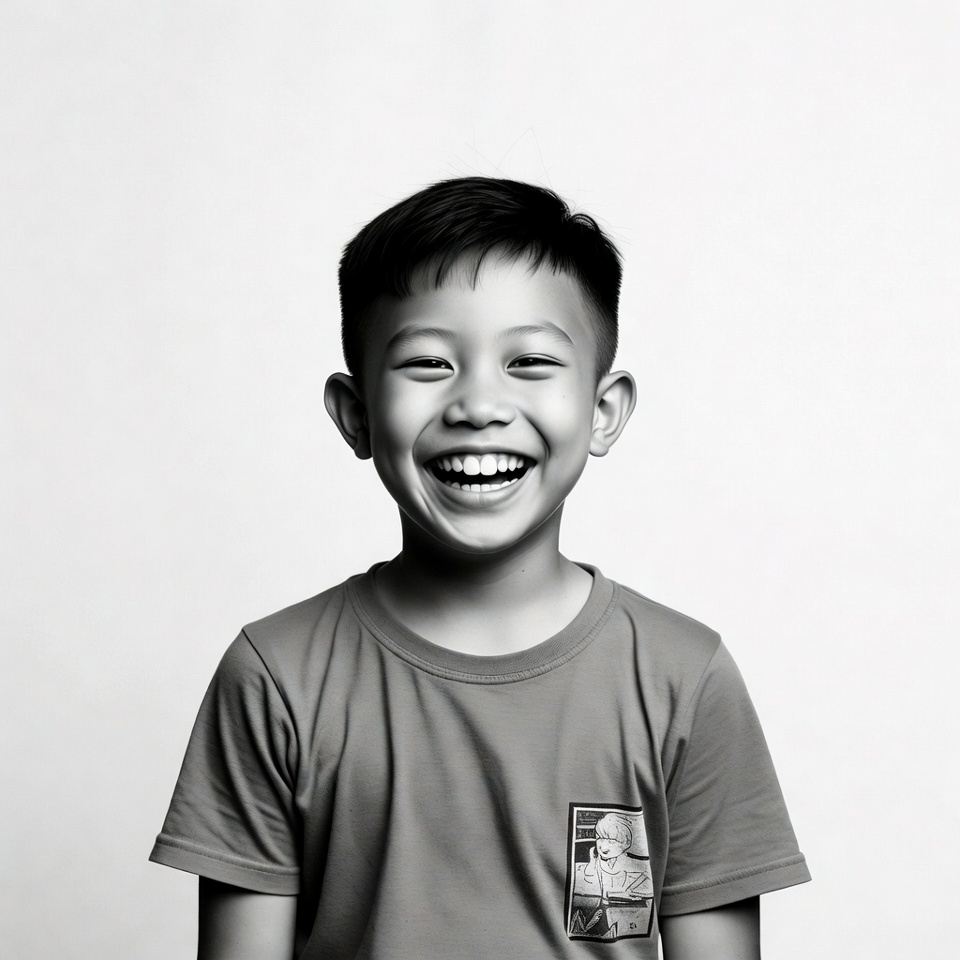 Asian, Asian boy, black and white, black hair, cheerful child, child, front view, gray t-shirt, happy boy, isolated background, laughing, male, monochrome photo, portrait print, short hair, smiling boy, t-shirt, wide smile, young boy, boy