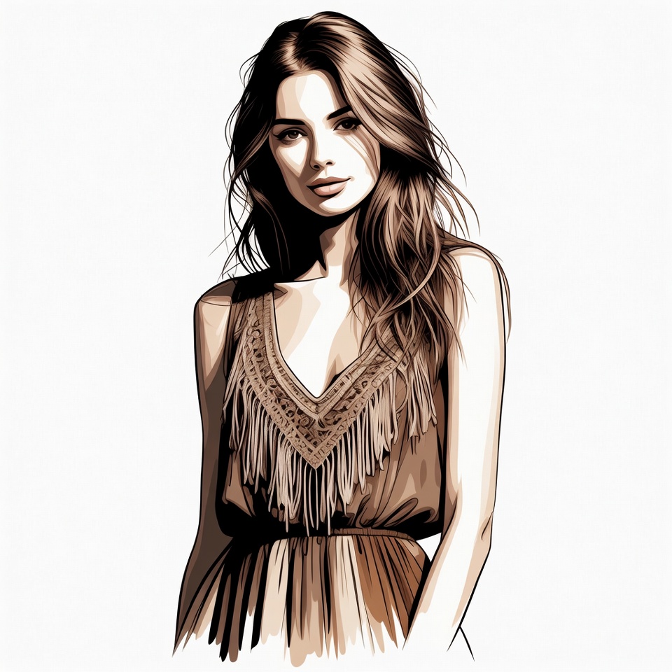 A detailed digital illustration of a young woman with long wavy brown hair stands against a white background. She wears a sleeveless tan dress with intricate fringed embroidery along the deep V-neckline. Her expression is serene with subtle shading enhancing her facial features.