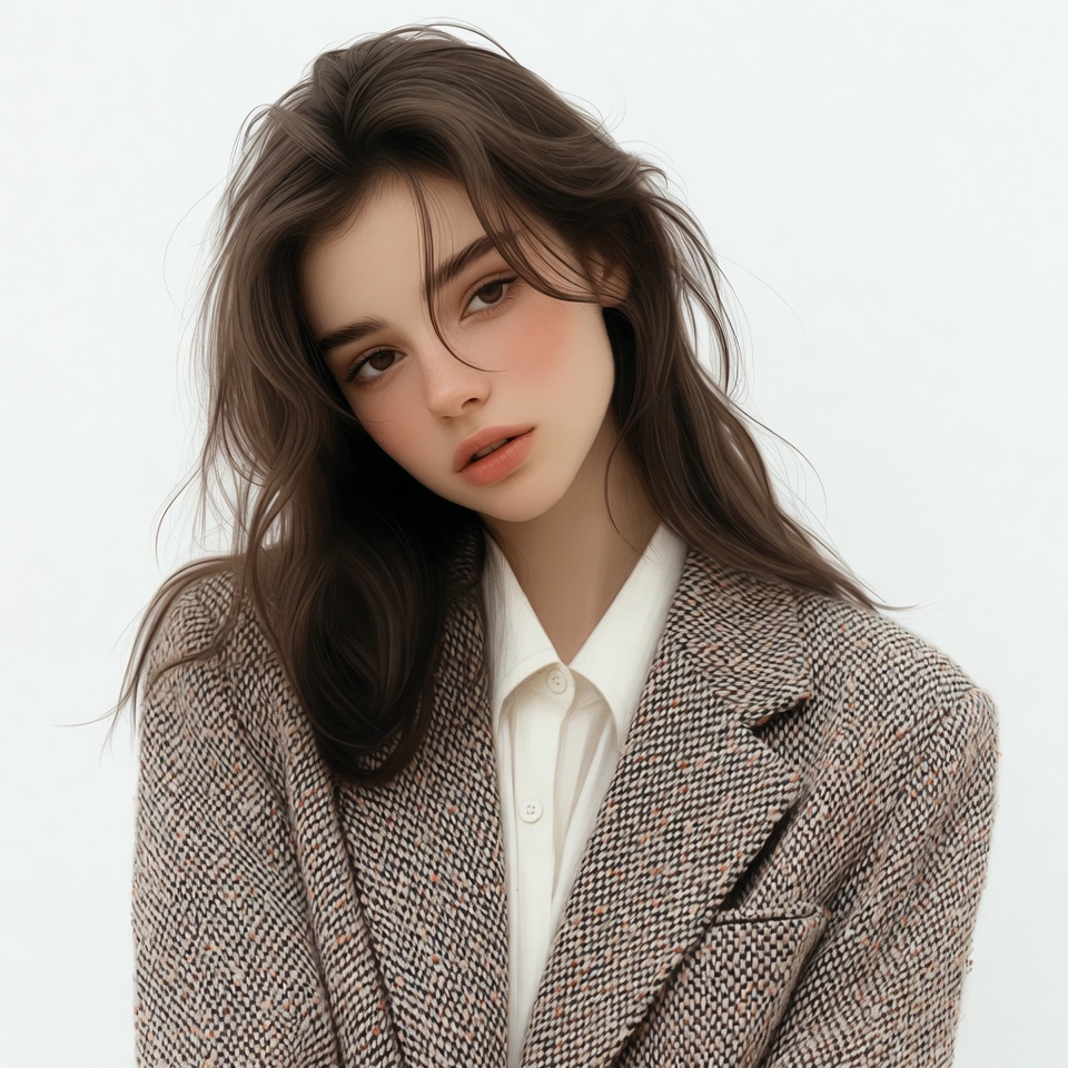 A young woman with long wavy brown hair tilts her head slightly while gazing at the camera. She wears a white collared shirt under a textured tweed blazer. Her makeup features soft pink blush and subtle lip color on an isolated white background.