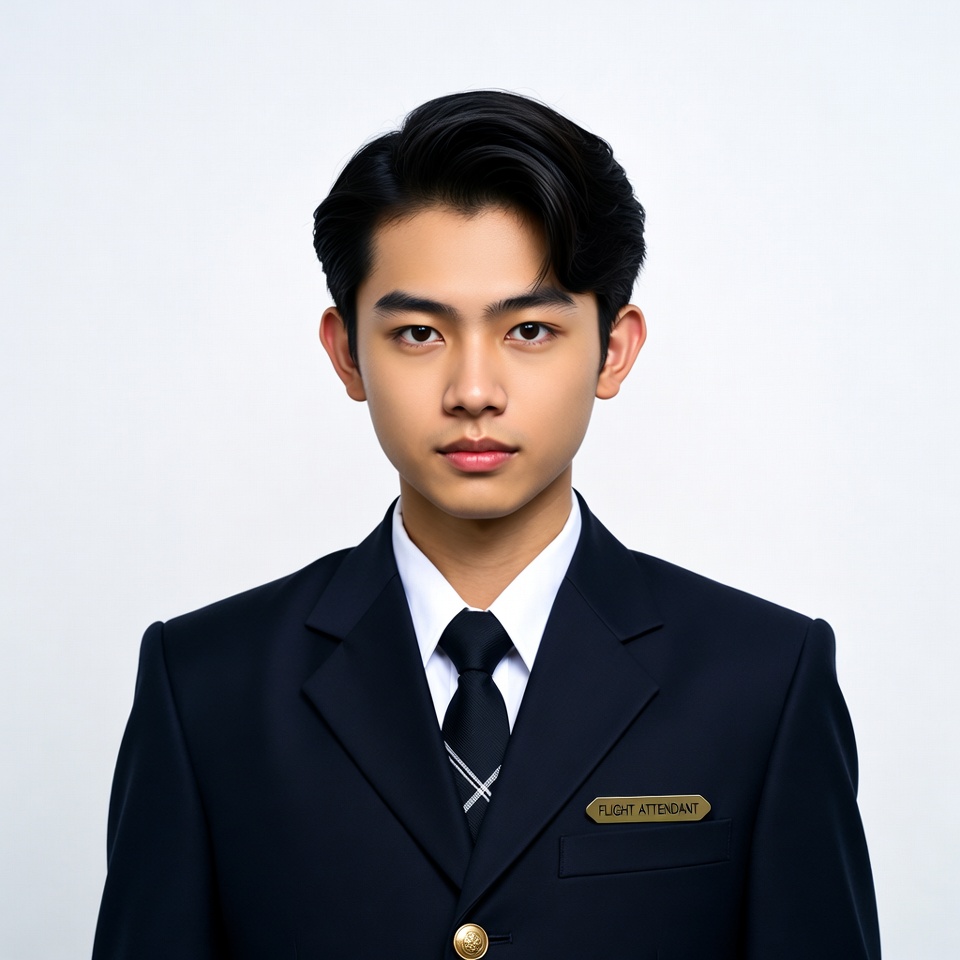 A young Asian man with short black hair stands in a formal pose wearing a navy blue flight attendant uniform. He has a name badge on his jacket lapel, a white shirt, black tie, and gold buttons. The image is a headshot against a plain white background.
