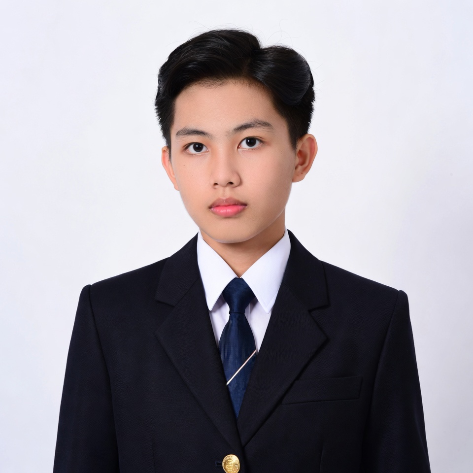 Asian, black hair, dress shirt, formal wear, gold buttons, male, navy suit, navy tie, portrait, school uniform, schoolboy, short hair, striped tie, student, suit jacket, white background, white shirt, young boy, boy