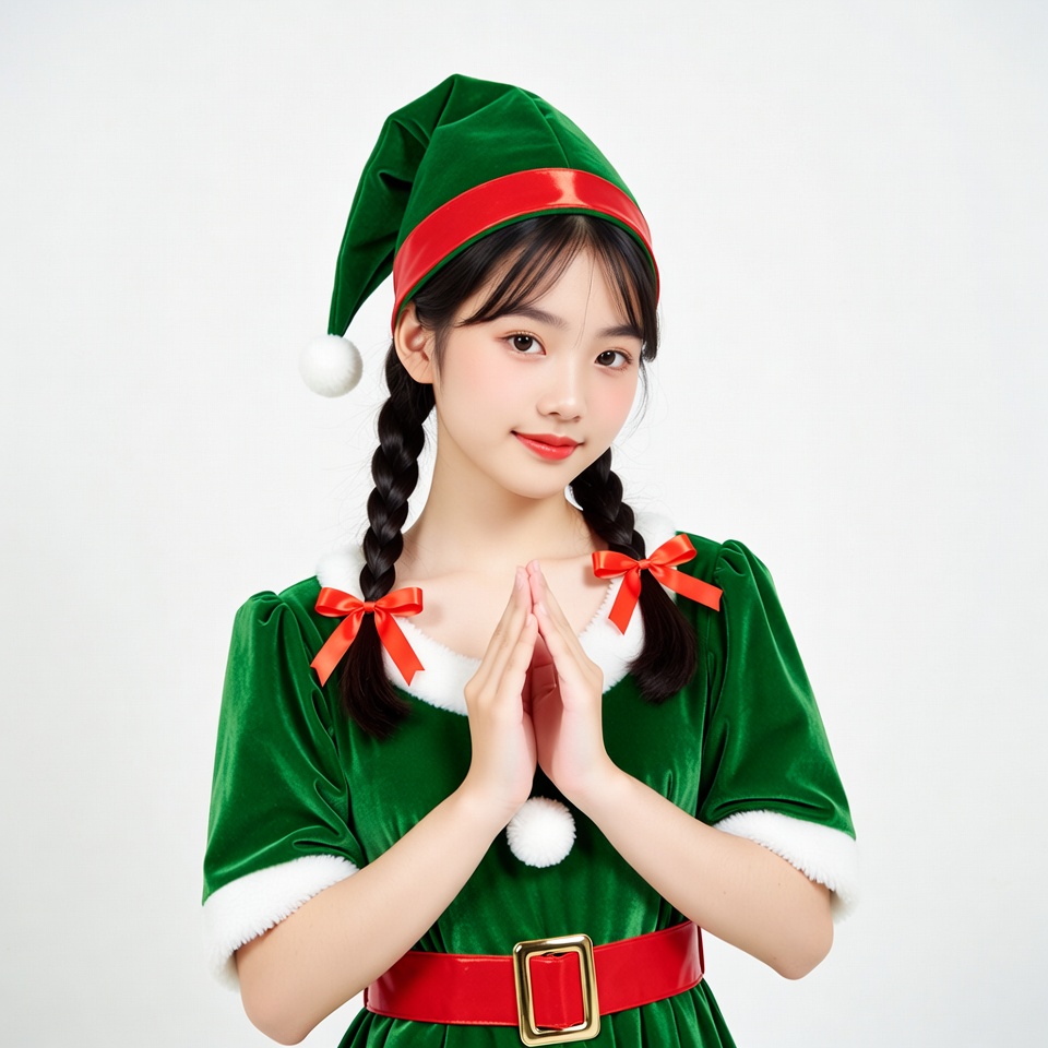 A young Asian girl with braided hair wears a green elf costume featuring a red-trimmed hat with a white pom-pom and matching green dress with white fur trim. She stands with hands pressed together in a prayer gesture against a plain white background. Red bows adorn her dress shoulders and a wide red belt cinches her waist.