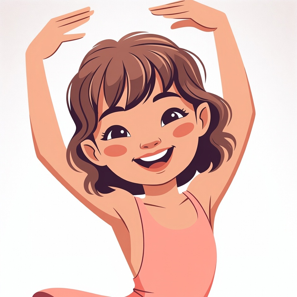 A cute cartoon girl with brown wavy hair smiles happily while raising her arms in a ballet dancer pose. She wears a pink sleeveless leotard and tutu, standing against a white isolated background. Her large expressive eyes and rosy cheeks add to the cheerful illustration style.