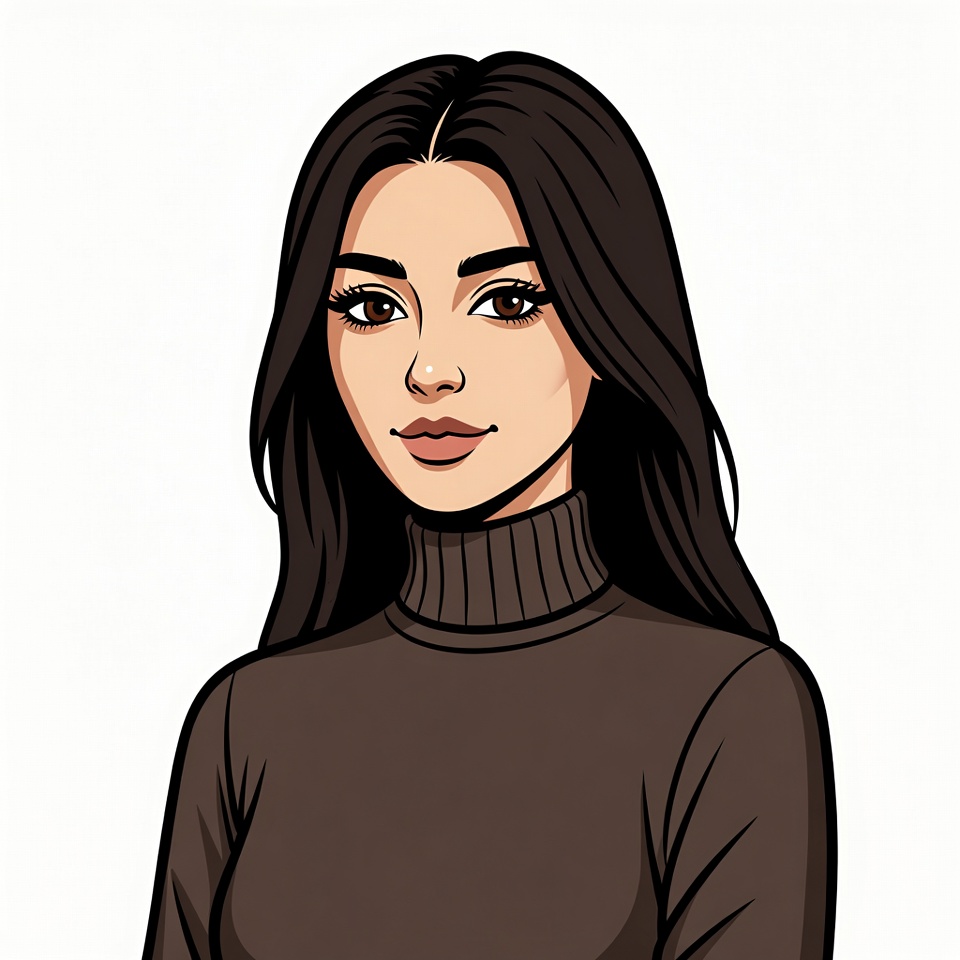 A cartoon illustration of a young Asian woman with long dark hair and almond-shaped eyes. She wears a brown turtleneck sweater and faces forward with a subtle smile. The image features a clean white background.
