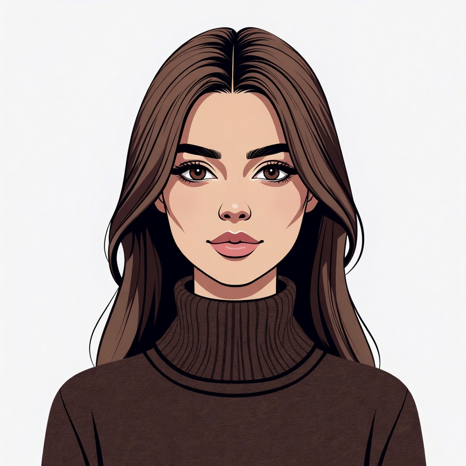 A young woman with long wavy brown hair and almond-shaped eyes gazes forward. She wears a brown turtleneck sweater and has a subtle smile with pink lips. The illustration features her face and upper body on a white isolated background.