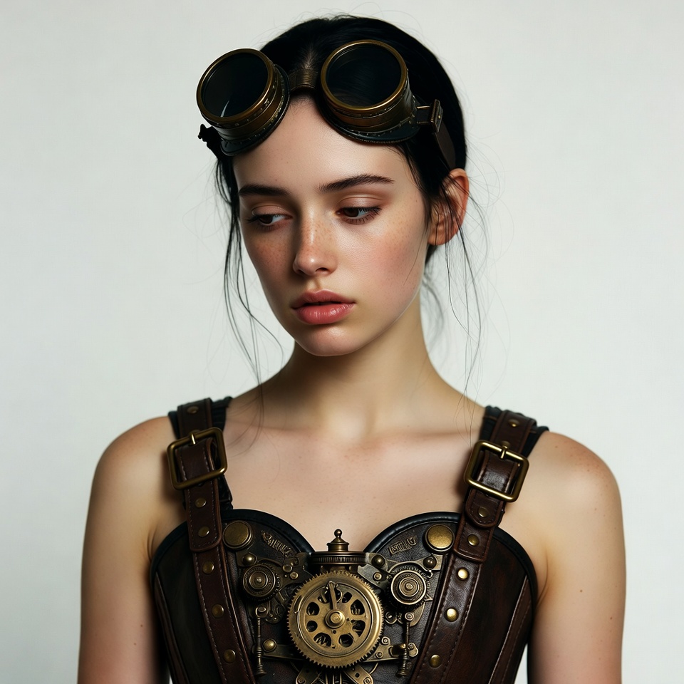 A young woman with long dark hair wears oversized steampunk goggles on her head and a detailed leather corset adorned with brass gears and clockwork mechanisms. She has a thoughtful expression with subtle freckles and stands against a plain white background. Her shoulders are bare, emphasizing the intricate Victorian-inspired outfit.