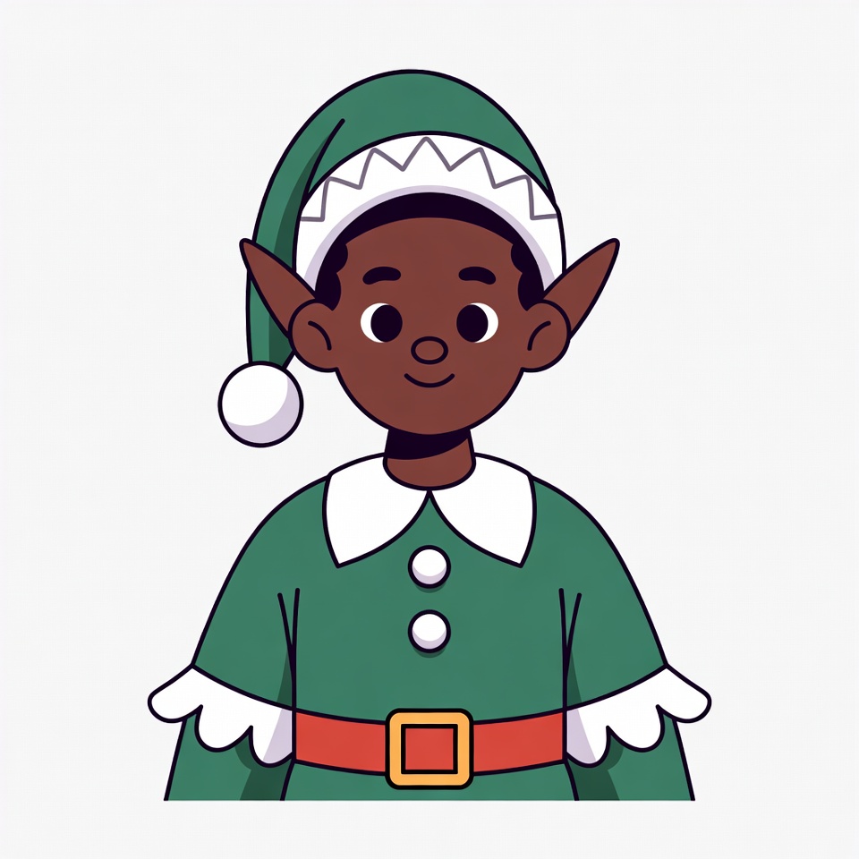 African-American, Christmas elf, boy, cartoon, clipart, cute elf, elf ears, festive elf, green hat, green tunic, holiday character, illustration, isolated background, pointy ears, red belt, smiling elf, vector art, white pom-pom, young elf, elf