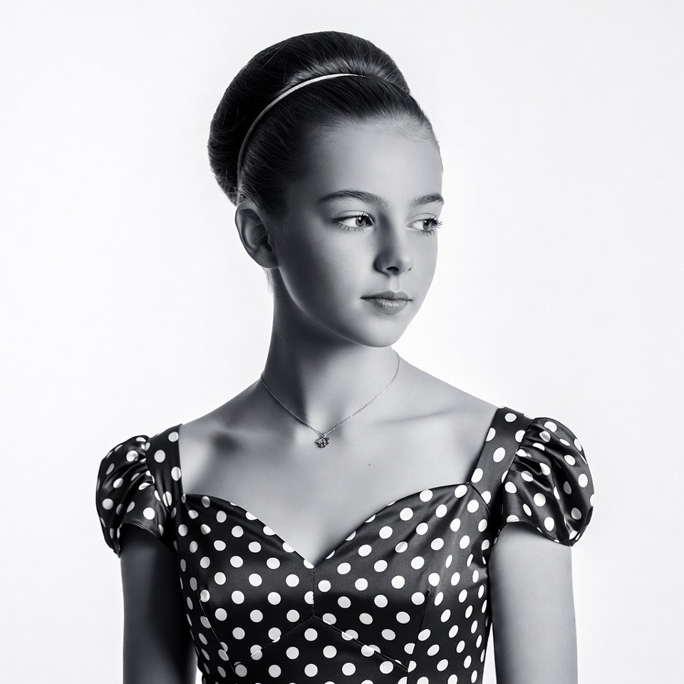 A young girl with dark hair styled in an elegant updo and a headband poses in profile view against a white background. She wears a black polka dot dress with puffed short sleeves and a square neckline, along with a delicate necklace. Her expression is soft and contemplative.