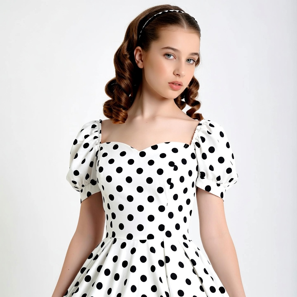 White, brown hair, curly hair, cute girl, fashion, female, headband, isolated background, pearl headband, polka dot dress, polka dots, portrait, puffed sleeves, retro dress, smiling, standing, sweetheart neckline, white dress, young girl, girl