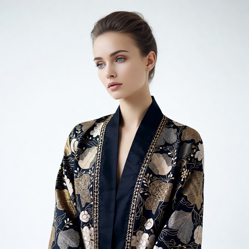 A young woman with long brown hair styled in an updo gazes to the side against a white background. She wears a luxurious black kimono robe with intricate gold floral embroidery and a deep V-neckline. Her blue eyes and subtle makeup enhance her elegant profile.