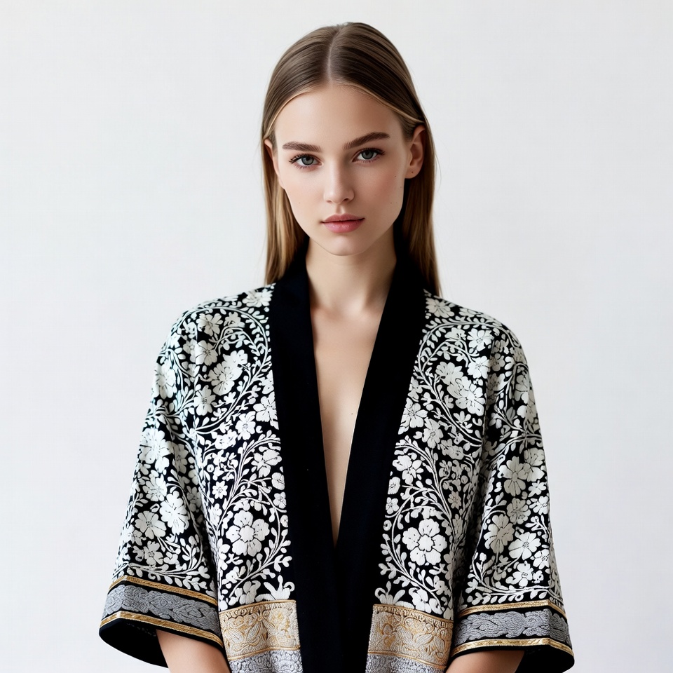 A young woman with long straight brown hair stands against a white background wearing an ornate kimono-style robe. The robe features intricate white floral embroidery on black fabric with gold trim along the edges. She gazes directly at the camera with a neutral expression.