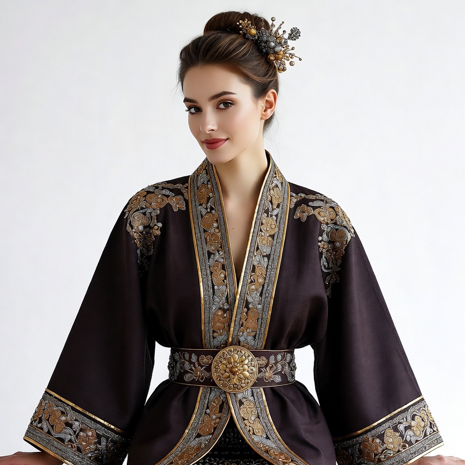 A young woman with brunette hair styled in an elegant updo adorned with gold hair accessories poses gracefully. She wears a dark purple kimono featuring intricate gold embroidery along the wide sleeves, collar, and obi belt with a decorative clasp. The image is set against a plain white background.