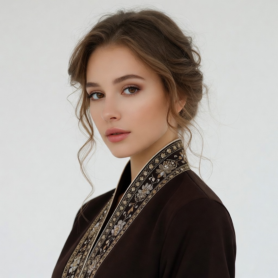 A young woman with long wavy brown hair styled in a loose updo gazes slightly to the side against a white background. She wears a dark brown blazer featuring intricate gold embroidery along the collar and edges. Her makeup is natural with subtle eye and lip enhancements.